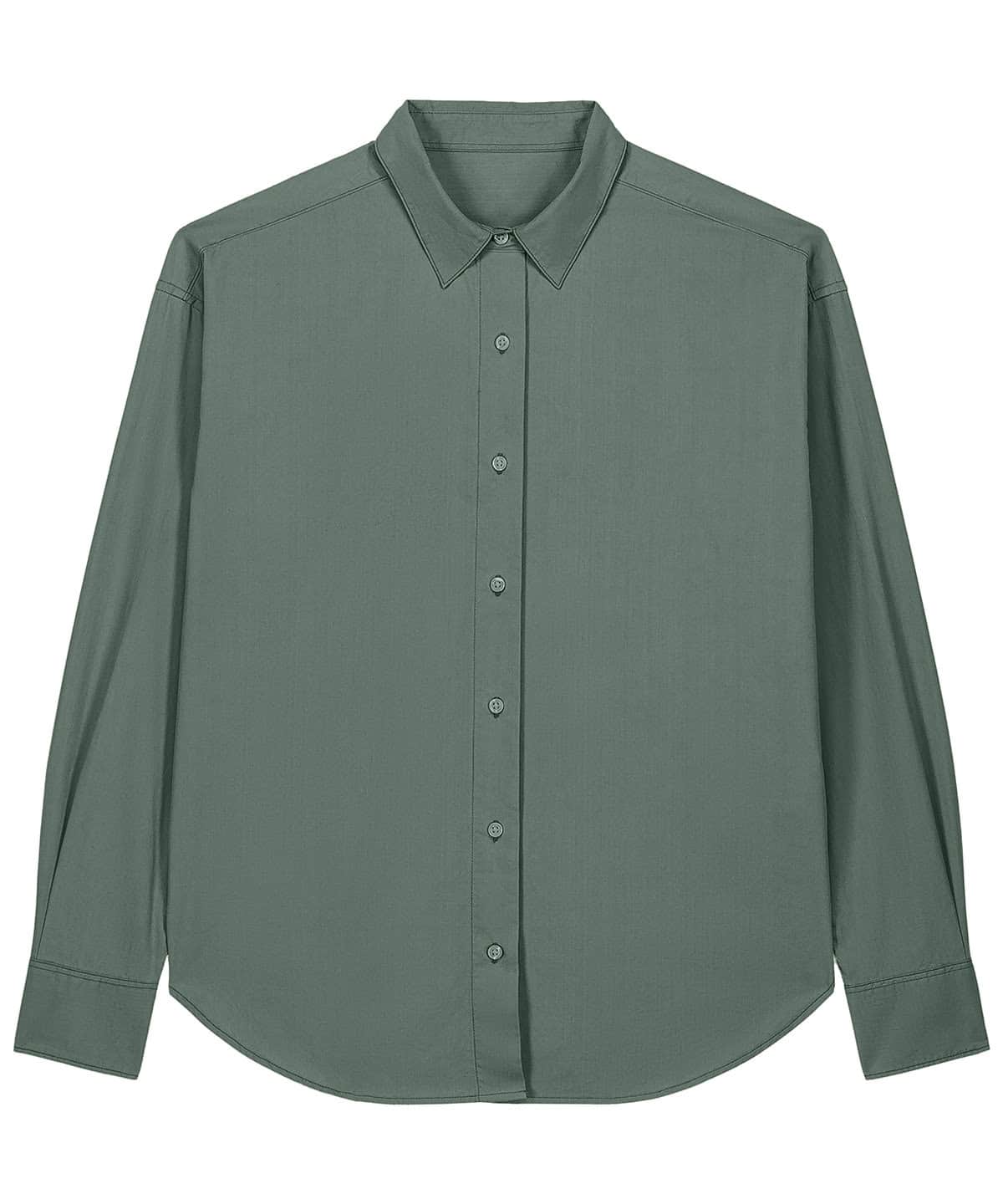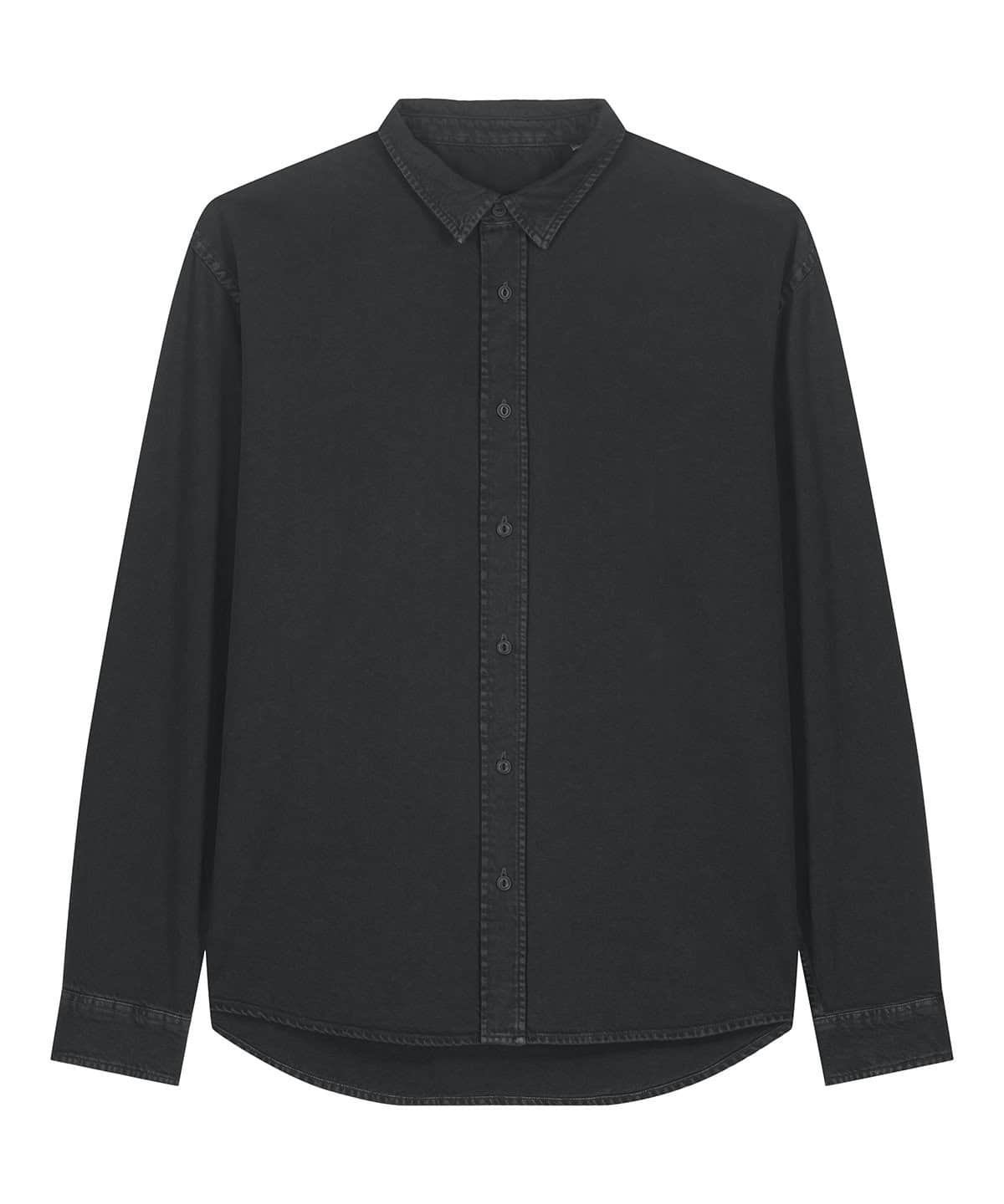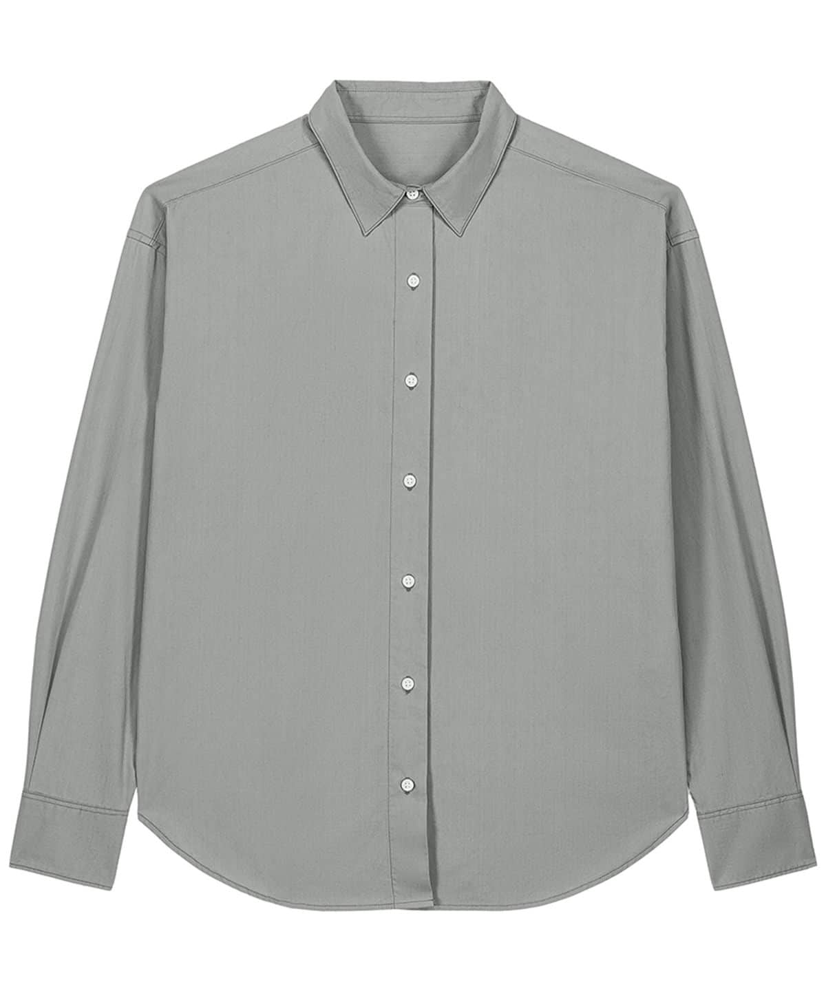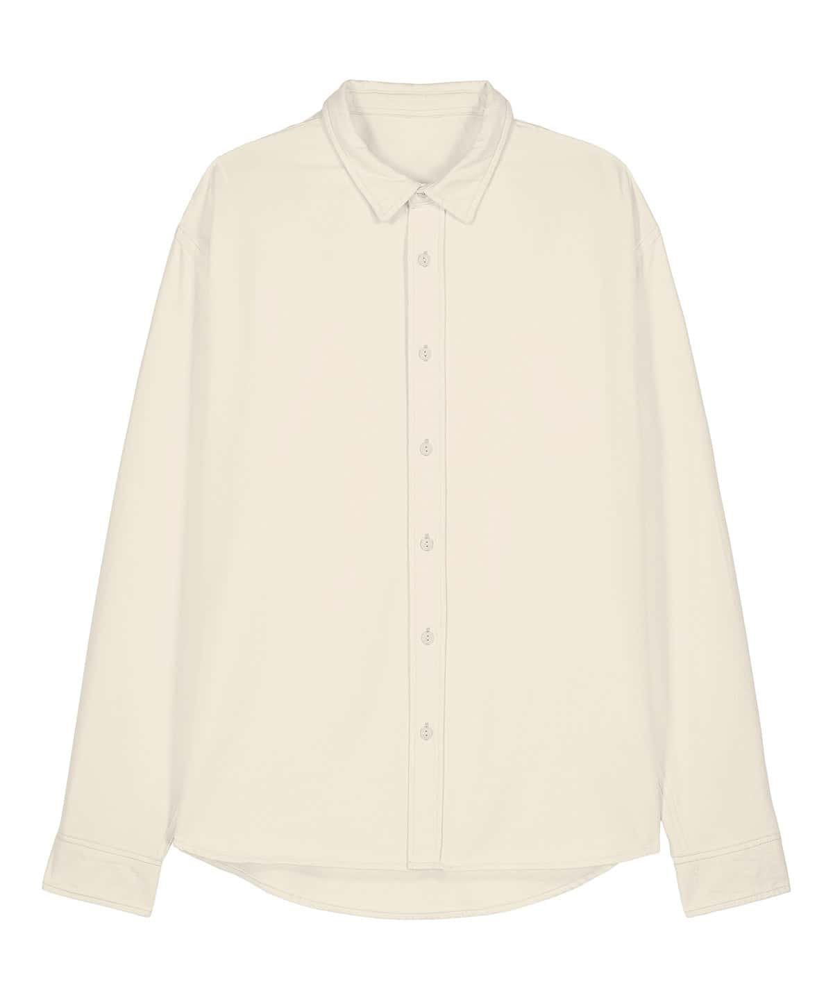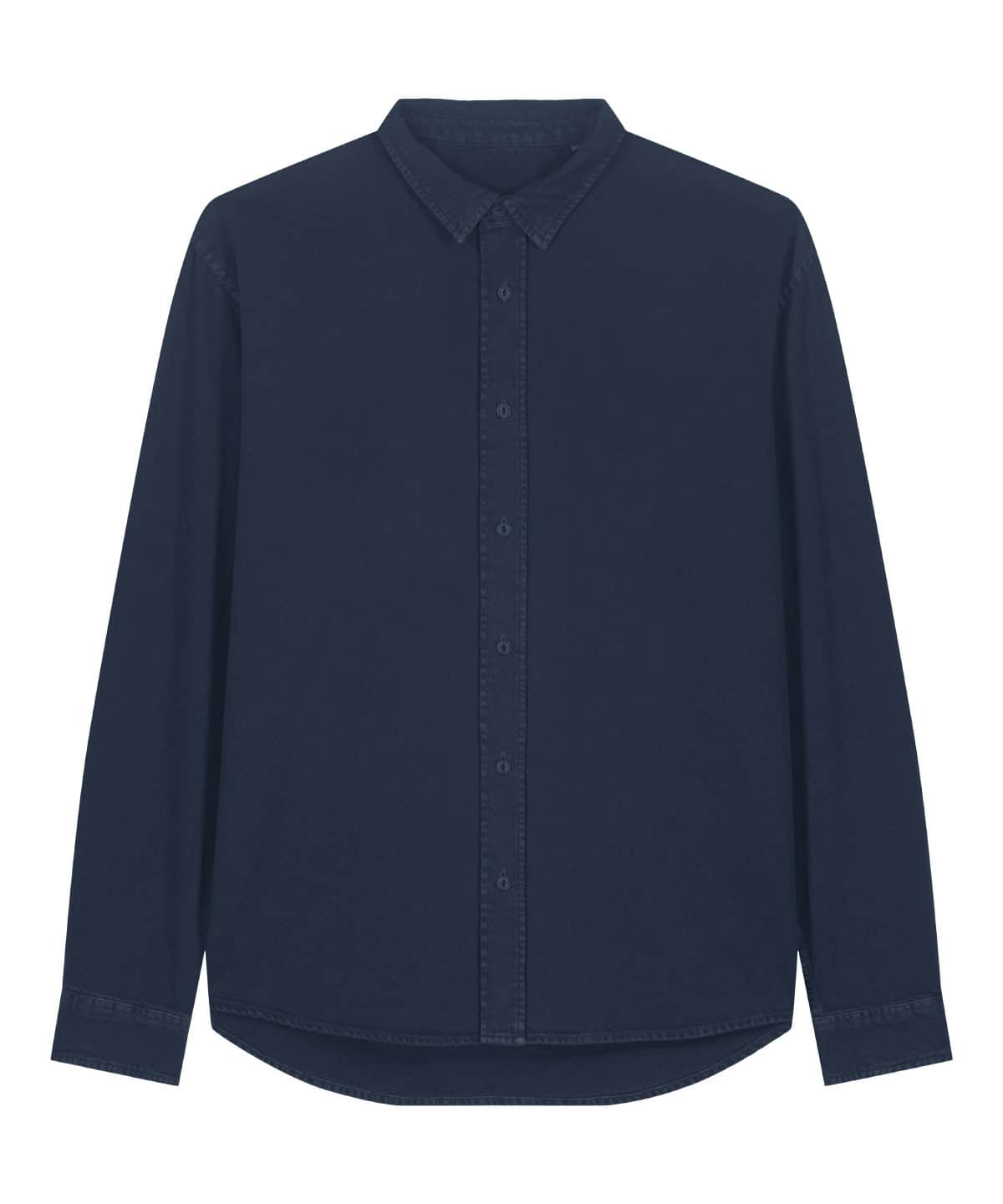 Product details: The Worker shirt. Relaxed unisex fit. Point collar with single-needle topstitches. Collar stand. Front placket with single-needle topstitches on each side. Forwarded shoulder. Back yoke. Inside yoke in self-fabric. Set-in sleeves. Sleeve placket with one button. Cuff with two buttons. Rounded cuff corners. Double pleats at cuff seam.
