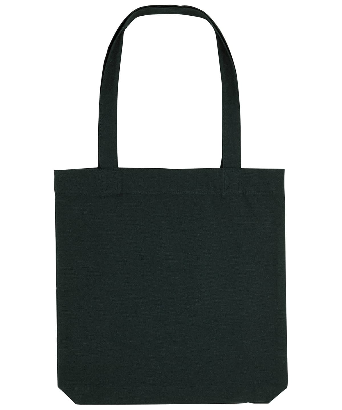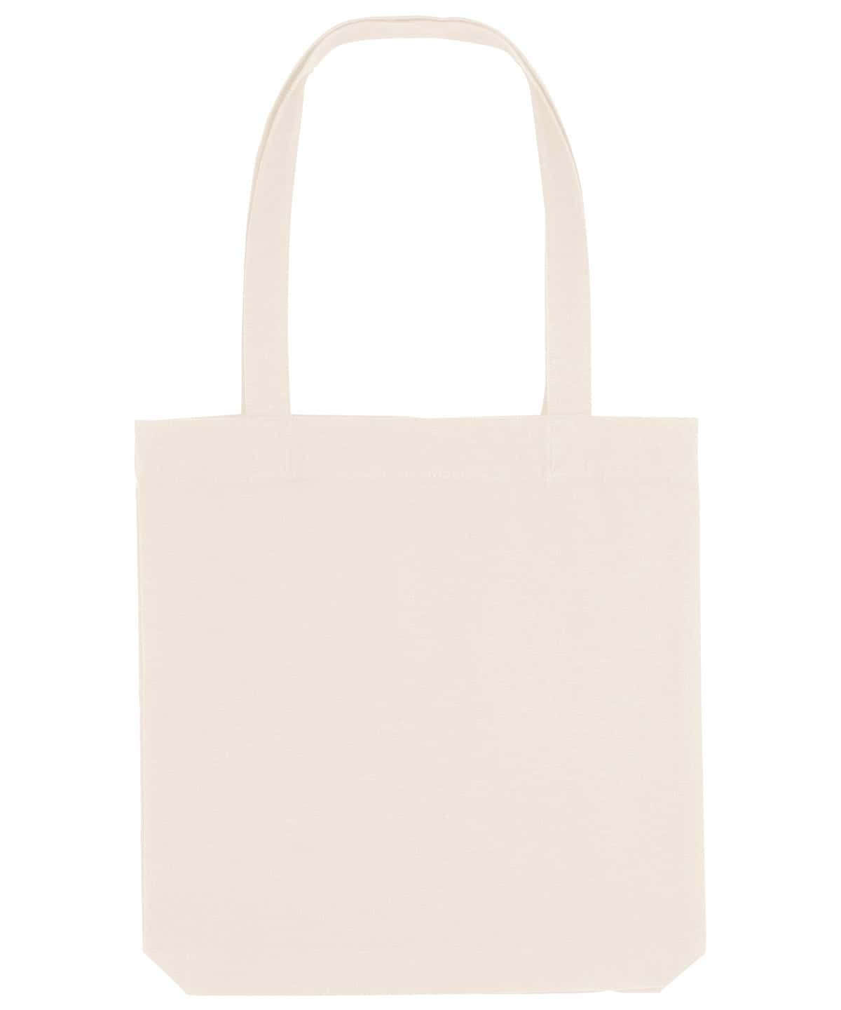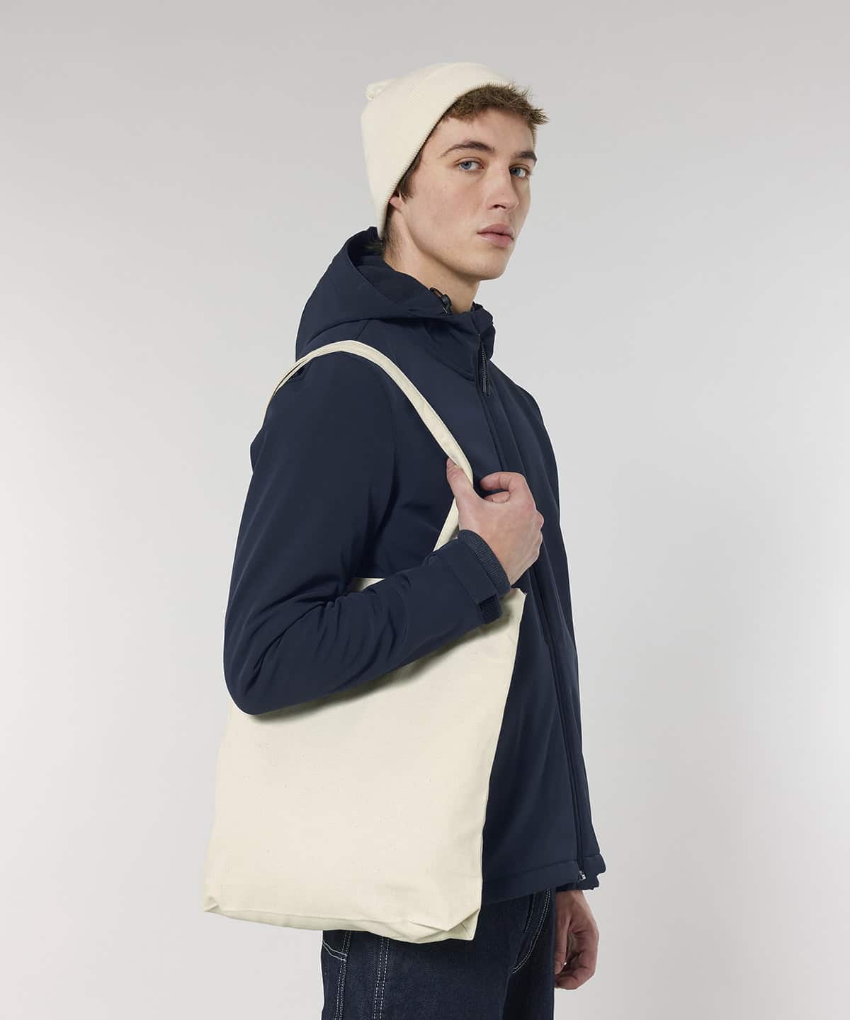 Product details: Top edge double folded for strength and clean finish. long handles with reinforced cross stitch. Shaping seam at bottom to create volume. Unisex. 80% recycled cotton, 20% recycled polyester. Canvas